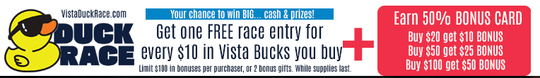During Duck Race Season (May 9–18), shoppers can earn one duck entry for every $10 spent at any Downtown Vista business (limit four entries per receipt) by uploading a photo of their receipt at VistaDuckRace.com. Several businesses are also offering meal deals and other promotions during Duck Race Season!