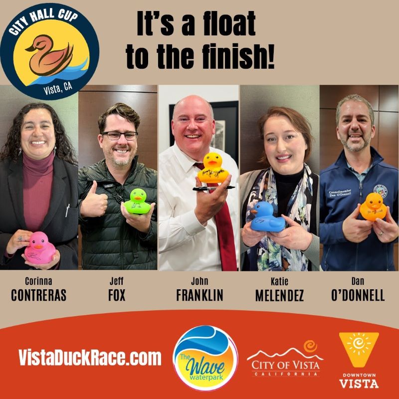 The 24th Annual Vista Duck Race launches this Sunday, May 18, 2025, at the Wave Waterpark from 1–4 p.m. Admission is $5 and includes entry to win over $10,000 in prizes as thousands of rubber ducks race down the Ripetide Slide at 2:30 p.m. Extra entries can be earned by purchasing Vista Bucks, shopping locally, or uploading selfies. The ‘City Hall Cup’ features a race between five autographed ducks, each representing a member of Vista’s City Council. Winners will receive a $25 Vista Bucks Card along with the autographed duck!
