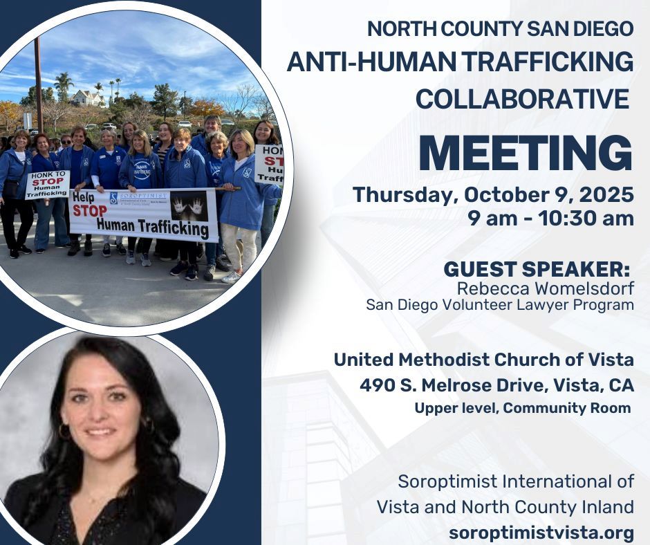 October 2025, Vista, CA—Soroptimist International of Vista and North County Inland will host the North County Anti-Human Trafficking Collaborative meeting on Thursday, October 9 at 9 a.m. at United Methodist Church of Vista, 490 S. Melrose Ave., Vista in their upper level community room. The event is free to the public, and complimentary coffee and pastries will be provided. Guest speaker will be Rebecca Womelsdorf of the San Diego Volunteer Lawyer Program, Inc. (SDVLP). She will speak about the work they do to help trafficking victims clear their record, giving them a fresh start by removing barriers to employment, housing, higher education, family reunification and more. For more information email allison.5858@yahoo.com or nellynmj@gmail.com or call 760-758-1910 or 951-764-3719.