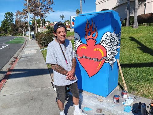 I asked James if he was a veteran and he said he was a veteran of the arts and of the streets. James said he has been through some challenging times, but it is good to see him use the talent he has in turning what is an ugly, big green and grey metal box on the street corners where traffic lights are into beautiful, unique, colorful conversation pieces to look at while you wait for the lights to change. Take a look at the artwork of James Faber on the corner of Melrose Drive and Buena Vista Drive and look for more coming soon on Melrose Drive at the corners where traffic lights are located. If you are interested in James’s artwork, he can be reached at 760-415-5857.