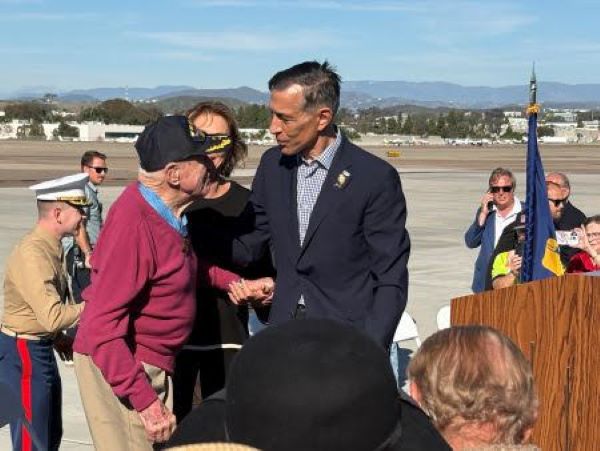 Congressman Darrell Issa worked tirelessly to ensure that Williams received the Nation’s highest military award for his bravery, the Congressional Medal of Honor. Captain Royce Williams is now the oldest living recipient of the Medal of Honor. He returned to Palomar Airport after receiving the medal in Washington, to hundreds of people waiting for his arrival from the chartered plane that brought him back. Captain Williams is a resident of Escondido, California. Close to 500 people swarmed Carlsbad’s Palomar Airport, with the Carlsbad Jet Center hosting the event, to greet him as he came down the steps of the chartered jet, where he was met at the bottom by Congressman Issa. The ovation was rousing as he came down the steps. Members of Veterans organizations from around the County were there to welcome him back, including the American Legion, Buffalo Soldiers, Veterans of Foreign Wars, Veterans Writing Group, Veterans Association of North County, and many others.