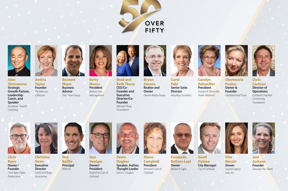 “We’re shining a spotlight on the power of experience,” said Carlsbad Chamber President and CEO, Bret Schanzenbach. “Our Top 50 Over 50 are not only leaders in business, but also mentors, visionaries, and catalysts for positive change in Carlsbad.”
