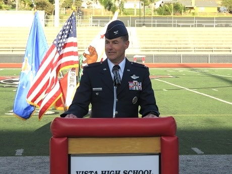 Following the formalities of the opening, Colonel Lostetter welcomed those in attendance and told the Cadets why he had brought them down to the track in front of the podium for this ceremony. He said he wanted to see all of them up close and personal and for them to see and focus on what he had to say to them. The Colonel told them and the audience how proud he was proud of their 11,000 community service hours they had accumulated for the last 4 years and the 32,000 they had accumulated since he took over the program. He spoke about the many people he will always remember who helped build the JROTC program, listing many such as Larry Peterson who assisted in getting uniforms and other items for the program, all of the ladies in the finance office for Vista High School who helped him find ways to come up with needed items for the program. He thanked Superintendent Dr. Doyle and Vista High Principal Megan Ratliff for believing in him and the importance of the program and his wife and family for knowing what it is like to be married to someone in the military, their commitment, and the necessary sacrifices. He talked to the cadets about their commitment, the things they have accomplished and their future goals. He referenced graduates like Coast Guard Ensign Jesus Gomez, in attendance, and how important it is to remember where they came from and the importance of giving back. The Colonel spoke about the Cadets maintaining their Integrity, Service and Excellence in their life. He finished with a story about his relationship with the keynote speaker, Major General (Ret.) Scott Vander Hamm.