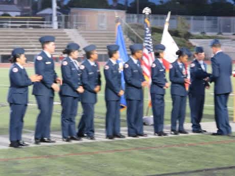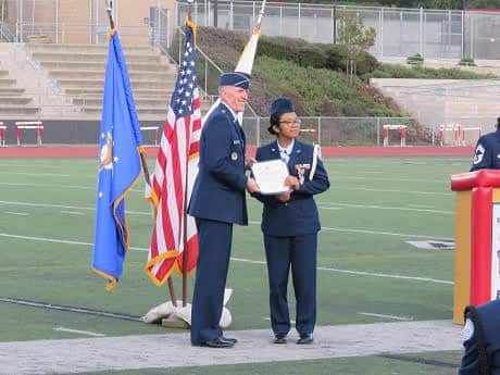 It was a chilly evening last Friday as the JROTC Cadets from Vista High School gathered on the grounds of the Dick Haines Stadium, along with family members and distinguished guests, for the annual Awards Ceremony, Change of Command, and Military Pass in Review. This event would also be significant as it marked the final ceremony as the official Senior Aerospace Science Instructor for Vista High School, Colonel (Ret. U.S. Air Force) Vincent J. Lostetter, Jr.. Colonel Lostetter has served in this position for the past 12 years after serving in the U.S. Air Force for 24 years active duty, graduating from the U. S. Air Force Academy. During his time on active duty, he also served for 22 months in the Pentagon. A graduate of San Marcos High School, the Colonel said after his time on active duty he looked into a variety of new career options, all of which led him to find the position was open at Vista High School for someone to run the JROTC program. He said he felt Vista was where he belonged. While at Vista High the Colonel built the program, increased student involvement and added a unique aviation program where students can get college credit through Palomar Jr. College. The Colonel said he came to the program thinking of how much he could teach the students but over the years has found the students have taught him so much more. He said, โ€œthe students have done so much more for me than I have for themโ€. He specifically said PATIENCE has been one of the most beneficial qualities the students have taught him. When asked what he would be doing after he retired, Lostetter said he knows he has a big โ€œhoney-doโ€ list of things to do, but he wants 6 months to simply do nothing, visit family, maybe take a cruise and kick back. He said he will probably occasionally volunteer to help the JROTC program, especially with the aviation program he brought to Vista High. His replacement will be Aerospace Science Instructor Chief Staff Sergeant (Ret. U.S. Air Force) Donna J. Goodno, who has been with the program for 5 years. The Chief said she is excited to take over the program, looks forward to the challenges and hopes the Colonel stays involved in some way.