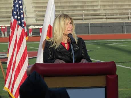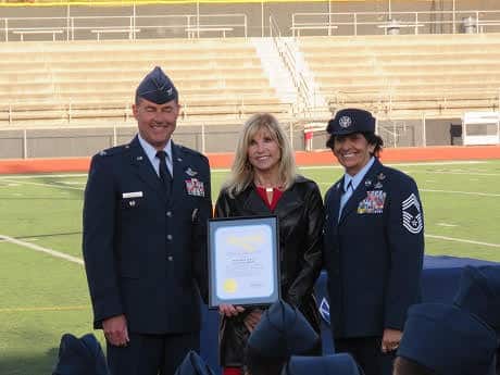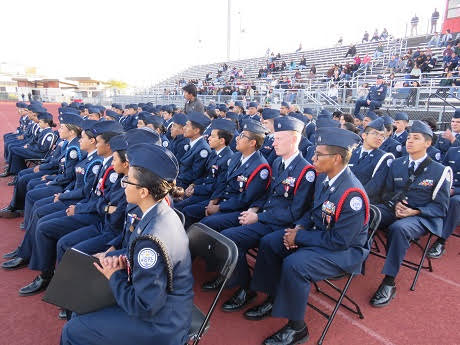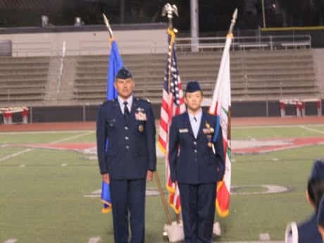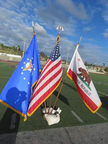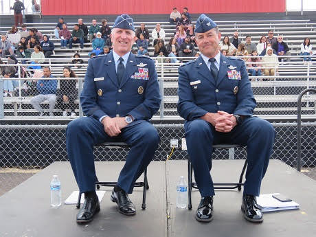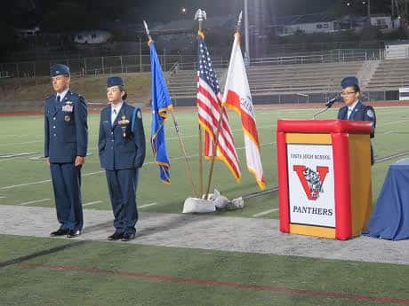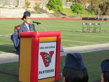 A VIP reception was held just prior to the start of the Friday program. The reception included meeting the Colonel and the special keynote speaker for the evening, Major General (Ret. U.S. Air Force) Scott Vander Hamm. A light meal of pulled pork, specially prepared by the Colonel, with cole slaw, prepared by the cadets, was offered before heading out to the Dick Haines Stadium. As people entered the stadium, they were entertained by the sounds of the String Ensemble made up of Vista students from various schools, covering grades 3-12 who meet at The Leadership Academy and perform for various functions. The annual ceremony began with Master of Ceremonies Cadet Staff Sergeant Jade Marin welcoming those in attendance and introducing several distinguished guests, including Vista Unified School District Superintendent Dr. Matthew Doyle, Vista High School Principal Megan Ratliff, Vista High School Assistant Principal Paul Zendejas, District 74 Assemblywoman Laurie Davies, Vista Councilmember Jeff Fox, former Vista Councilmember Amanda Rigby and several presenters from different organizations. Cadet Flight Commander and 2nd Lt. Kelly Dominguez led the Cadets and the audience in an invocation. Assemblywoman Laurie Davies read and gave a proclamation to Colonel Lostetter honoring the program and the Cadets of Vista High School.