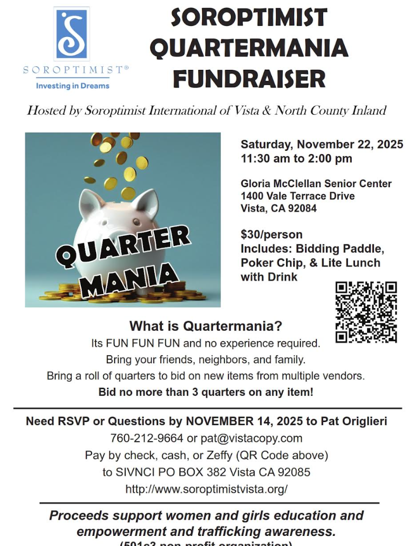 VISTA, California—Soroptimist International of Vista and North County Inland will host a QuarterMania Fundraiser on Saturday, November 22 from 11:30 a.m. to 2 p.m. at the Gloria McClellan Senior Center, 1400 Vale Terrace Drive, Vista. Doors open at 11:30 am for check-in, lunch and viewing up to 10 vendor booths. Tickets are $30 and include bidding paddle and poker chip, light lunch and non-alcoholic drink. There will be an opportunity drawing plus a silent auction. Guests are urged to bring plenty of quarters. Maximum bid is 3 quarters, so no one spends more than 75 cents on any item. “Get a jump on your holiday shopping, and bring your kids, friends, and neighbors to this family-friendly event,” said event chair Pat Origlieri. “And bring a roll of quarters!” she added. Additional paddles and quarters will be available for sale.