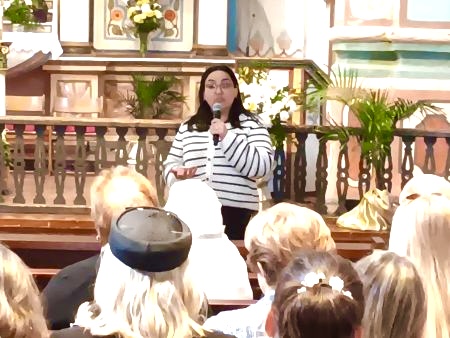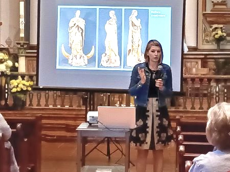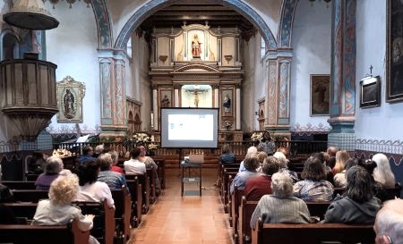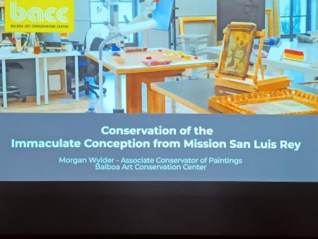 The statue was sent to the Balboa Art Conservation Center, in Balboa Park, in June of 2025, and for 10 months and roughly 100 hours of refurbishing, cleaning, restoration, and some minor repairs to the base, statue, and crown, the statue was returned to Mission San Luis Rey. Mission Museum Director Helena Hazelton welcomed those in attendance to the event and introduced Morgan Wylder, Associate Conservator of Paintings for the Balboa Art Conservation Center, who gave a slide show presentation and explanation of the work and process that had been accomplished to bring the goal of “making her look like her best self” to completion. Morgan explained the processes and materials used to clean areas with minor damage and to fill in portions of the wooden statue, particularly the stabilization of the statue’s base. One technique involved estofado, an artistic technique that imitates the appearance of gold brocade, making this 4-foot wooden statue appear golden.