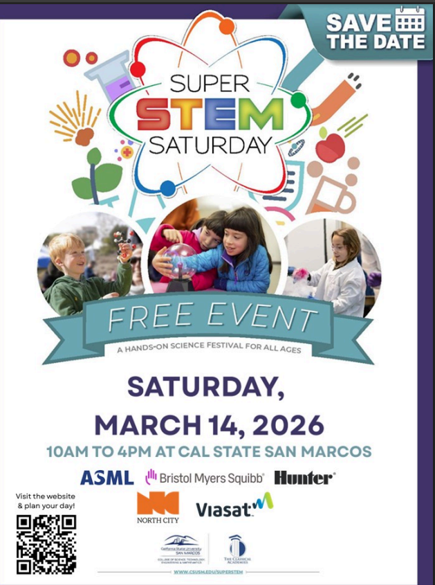 Hosted by The Classical Academies and CSUM and supported by regional leaders including Viasat, ASML, Bristol Myers Squibb, Hunter Industries, North City, Columbia Bank, Cox Communications, General Atomics Sciences Education Foundation, Grifols, Burns & McDonnell, Calsense, C.W. Driver, Dimensions Collaborative School, Hologic, Young, Minney & Corr LLP, and SignPost Studio, the event reflects a shared commitment to expanding access to science, technology, engineering, and math! Plan your day here. Download the event flyer here. We can’t wait to see you there!