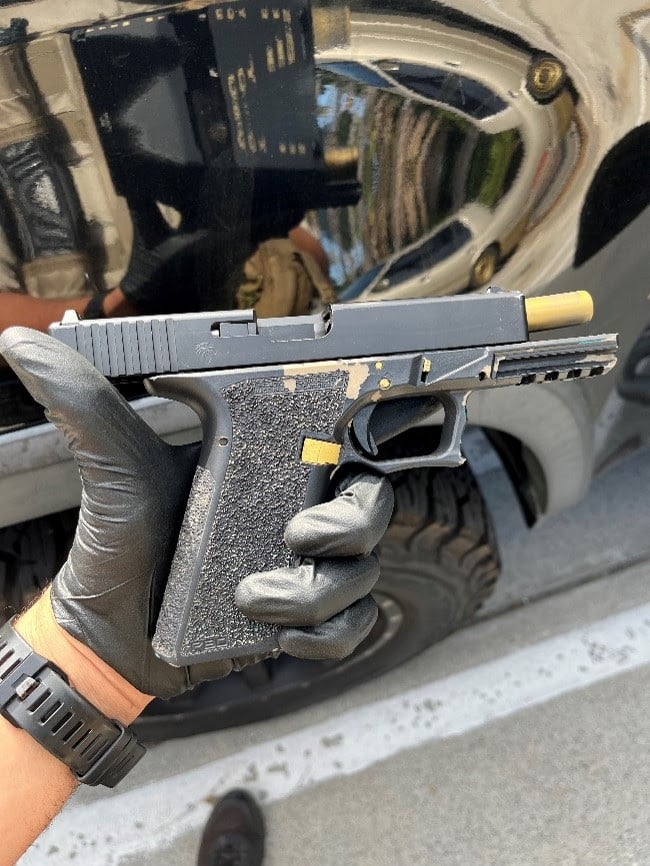 The firearm was seized and rendered safe. It was discovered that the firearm was altered, un-serialized, and had live ammunition in the magazine. Unlike weapons made by a licensed manufacturer, private manufactured firearms (PMF), or ghost guns, do not have a serial number or other identifiable markings. The lack of a serial number makes it extremely challenging for law enforcement agencies to track these firearms to their owner or maker, hindering or delaying investigations and crime-solving efforts.