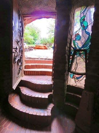 In eastern San Diego County, resting deep in the valley of Santa Ysabel lays one of the most beautiful, magical, surreal, and dreamlike architectural man-made wonders I have ever had the pleasure of visiting. Located on 10 acres of oak woodlands near Julian is the Ilan-Lael compound that encompasses the historic Hubbell home, living quarters, working art studios, gallery space, gardens, and the James and Anne Hubbell Center for the Arts. Ilan-Lael is Hebrew for “a tree that unites the physical and the spiritual,” which is a fitting name for this space that integrates art, nature, and community in a vibrant and energetic setting. In the late 1950’s, when Jim and Anne were just in their 20’s, they were looking for a place to start a family and finding nothing on the east coast, where they were from, they navigated west to California landing in San Diego. When driving around the county Jim came across the land in Julian and saw the potential of what it could offer him and his new wife. They purchased the land for around $500 an acre. Since then, James Hubbell has produced buildings, hand-crafted doors (like the Palace Doors of Abu Dhabi), stained-glass windows, gates, and sculptures all using wood, stone, metal, glass, and clay from the nearby areas. Everything is sustainable, made from the earth and his work takes on the feel as if it grew itself from the surrounding landscape. His designs, buildings, and structures are referred to as having an organic and life-like style, and sometimes “hobbit houses”. I felt as if it was more J.R.R. Tolkien’s Elvish meets Frank Lloyd Wright with the much-added details of Jim Henson’s Labyrinth. Especially once you see Uncle’s Bert’s Garden and all of the donated creatures and troll sculptures, you’ll understand. Everywhere you go on this property you feel the energy and life that this peaceful and magnificent landscape has to offer. With no pun intended, this includes one of my favorite buildings as well. The charmingly decorated crown shaped Adu Bathroom, which of course is the throne room, or guest bathroom, which sits in the middle of this property. The bright lemon-yellow tiles will definitely put a smile on your face the moment you walk in so don’t be afraid to ask for the bathroom while you are there visiting. I guarantee you will enjoy it.