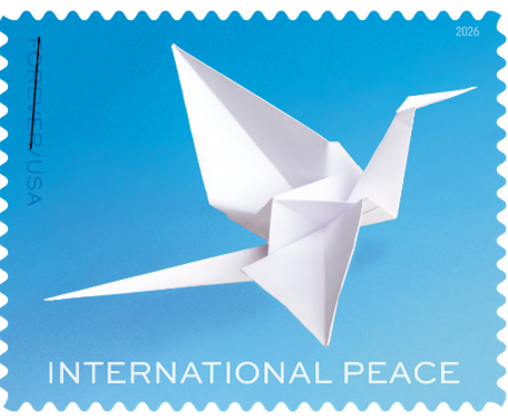 The U.S. Postal Service will issue an International Peace stamp featuring an origami peace crane on May 27, 2026, at the Boston World Exposition. The origami crane was folded by Peace Crane Project founder Sue DiCicco.