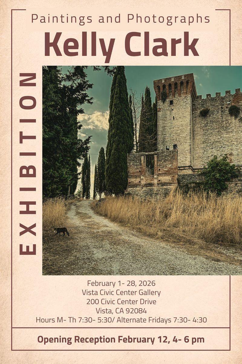 The Vista Civic Center Gallery is proud to announce “55”, a solo exhibition by multimedia artist Kelly Clark, opening February 2nd and running through February 27, 2026. This exhibition showcases new photographs and paintings from Ms. Clark’s artist residency in Italy, as well as other multi-media pieces encompassing flora, fauna, and abstracts.