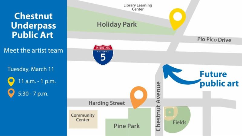 To help develop the concept for the Chestnut underpass public art project, Greenmeme is hosting two pop-up meet and greet events next week, on Tuesday, March 11. Stop by to learn more about the artists’ work and share your thoughts on what makes Carlsbad special.