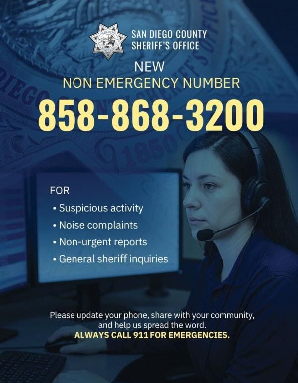 A reminder from the San Diego County Sheriff’s Office: we have a new non-emergency phone number.