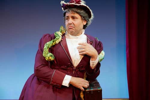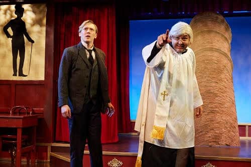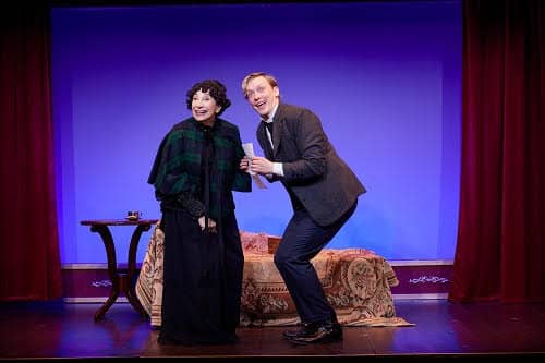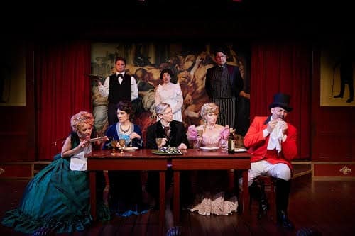 All of these performers have great voices and bring a tremendous range of acting skills, giving the audience a chance to understand Monty’s journey of mayhem and conspiracy in his quest. The final veteran North Coast Rep actor who plays the key roles of the entire doomed D’Ysquith family and is challenged with quick costume changes, changing personalities, mannerisms and voices is Nicholas Mongiardo-Cooper. Nicholas pulls this challenging role off with humor and ease as he takes on the roles of Lord Asquith D’Ysquith Sr., Asquith D’Ysquith Jr., Reverend Lord Ezekial D’Ysquith, Henry D’Ysquith, Lady Hyacinth D’Ysquith, Major Lord Bartholomew D’Ysquith, Lady Salome D’Ysquith Pumphrey and Lord Adalbert D’Ysquith. The funniest of the D’Ysquith clan that Nicholas portrays are the Reverand D’Ysquith, Lady Hyacinth, Lady Salome and Lord Adalbert. Each death is unusual with the demise of Henry and Major Lord Bartholomew the most unusual.