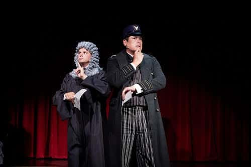 The cast begins with Andrew Polec who plays Monty. Andrew is on stage for the majority of the musical portraying a man who sets out with a scheme to become the Ninth Earl. This is Andrew’s North Coast Rep debut. As the mild young man who hatches this plan to rise to fame and fortune Andrew is perfect in presenting as a man who stumbles and fumbles his way to romance and eventual success in his efforts to succeed. Returning to North Coast Rep and playing Sibella is Lauren Weinberg. Lauren portrays a beautiful love interest of Monty, but who is a flighty woman who also seeks to rise in her position in life, just not by killing anyone. Jean Kauffman plays Miss Shingle and several other characters. This is also Jean’s debut at North Coast Rep. Miss Shingle is the woman who drops hints that Monty is a lost member of the D’Ysquith family, who says he is a member of the family as his mother was a D’Ysquith who had eloped with a Castilian musician and was disowned by the family as a result. Miss Shingle tells Monty he needs to take his place in the family line. Other cast members making their debut at North Coast Rep include Michael Cavinder, portraying Inspector Pinckney and in the ensemble; Andrew Hey as Tom Copley/Magistrate and in the ensemble; and Shinah Hey as Miss Barley/Lady Eugenia and also in the ensemble. Numerous costume changes and various character portrayals are key to this musical and these actors are wonderful in adding to the quickly paced musical. Katy Tang, a veteran of several North Coast Rep productions, plays Phoebe D’Ysquith. Phoebe is Henry D’Ysquith’s sister and becomes a love interest of Monty after Henry is killed. Phoebe and Sibella will become key to the closing of the musical as they both hatch a clever scheme to get Monty out of prison after he is found guilty of killing Lord Adalbert D’Ysquith and is serving time in prison.