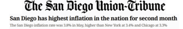In fact, San Diego recorded the highest inflation rate in the country last month for the second month in a row. Our inflation rate was 3.8% in May—higher than New York and more than six times higher than Dallas, which saw just 0.6%.
