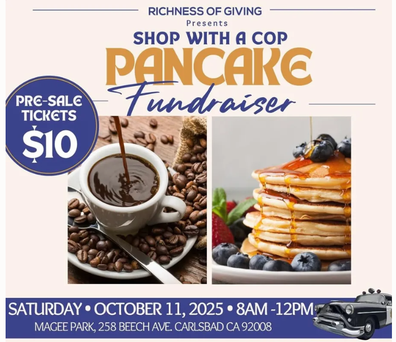 The Carlsbad Police Department and Richness of Giving (ROG) invite the community to join them for a morning of food, family fun, and giving back at the annual Shop with a Cop Pancake Breakfast on Saturday, October 11, 2025, from 8:00 AM to 12:00 PM, at Magee Park (258 Beech Avenue).