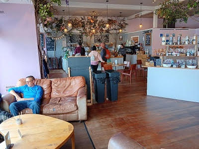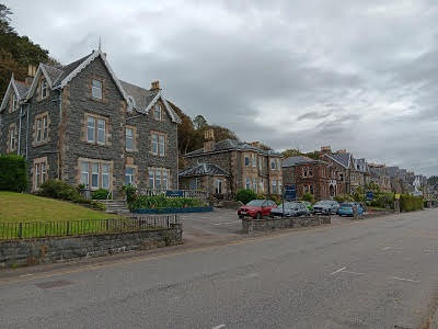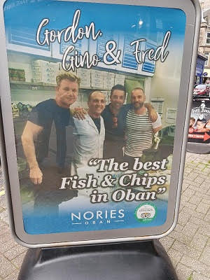 We took streets down, rather than the steps, and wandered through the hillside apartments and buildings. Reaching town, we walked down the street next to the harbor and found a busy place called the Oban Chocolate Company, established in 2003. Brian had a coffee, and I had hot chocolate. From here we wandered to the Oban War and Peace Museum. This small, free museum had quite a collection of items from various wars that citizens of Oban had been involved in, starting with WWI. They had a great collection of model ships and planes from different wars, especially sea planes. They also have quite a display of uniforms. It was a nice break and a quick trip back in time. We decided to walk to Dunollie Castle, a walk along the Esplanade along the harbor. We passed incredible, huge homes that were no longer used as private homes, but had all been turned into hotels, B&B’s or hostels. We made it to the castle grounds, but decided it was too pricy to see a castle that only had the tower remaining. It was first built in 600 and abandoned in the 10th century. It had been rebuilt many times and the existing ruins date to the 15th century. Walking back, we were hungry for lunch and Brian was a trooper and went with me to what is advertised as the Best Fish & Chips place in Oban, so crowned by Gordon Ramsey when he visited Oban. We ate in Nories Fish & Chips Shop, the oldest in Oban, with 3 generations of the same owners running the eatery. Brian got a deep-fried cheeseburger, something he had never had and probably won’t ever order again. He said it was unusual. I had a huge piece of haddock and great chips, with malt vinegar and an Irn Bru drink, a very sweet soda.