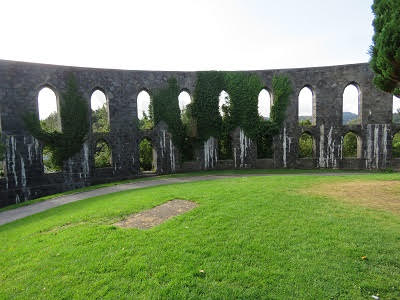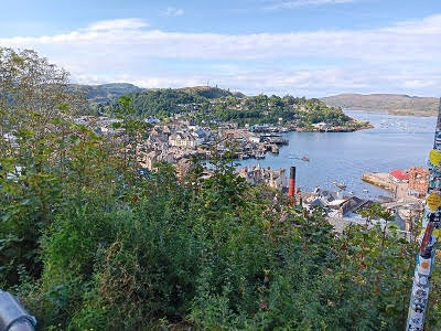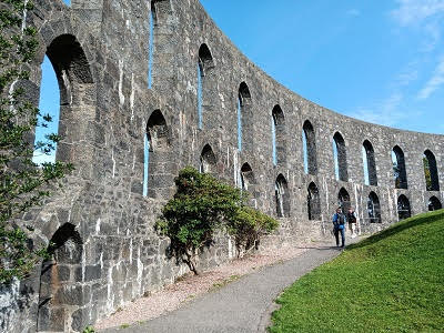 The second day in Oban began with a good breakfast and then we were on our own doing whatever we wanted to do for the day. Several in our group decided to take the ferry to the neighboring island of Mull, being reminded to not miss the ferry’s final boarding to return to Oban later in the day. Brian and I decided to wander the town and see what it had to offer. Oban has a population of about 8,000 people that swells to around 24,000 during tourist season. The modern town of Oban grew up around their distillery, but today it thrives on tourism and the ferry service to the islands of Inner and Outer Hebrides. It is also home to the Royal National Mod that occurs every 6-8 years. This is a celebration of the Scottish Galic culture. There is also an annual Highland Game held in the town. The first thing we did was get a map to the town and then figure out the best way to go up to McCaig’s Tower, an impressive monument built in 1897, financed by a local banker, John Stuart McCaig. He had it built to help out of work stonemasons find work in the winter and he wanted to leave a monument commemorating his family. Unfortunately, only the outer circular walls were completed before he died and the remaining family members no longer wanted to finance the unfinished construction of the project. Brian mapped out the streets we needed to take. I will have to admit it was a little higher than I imagined and there were more steps than I had pictured. But we made it, and the views of the town and islands were impressive.