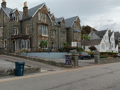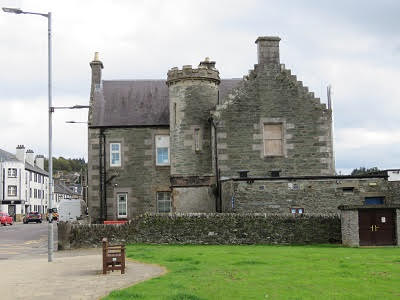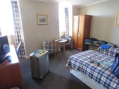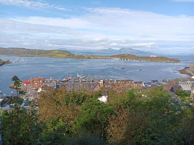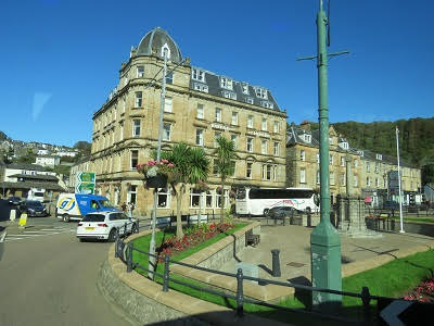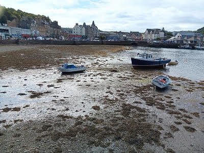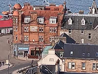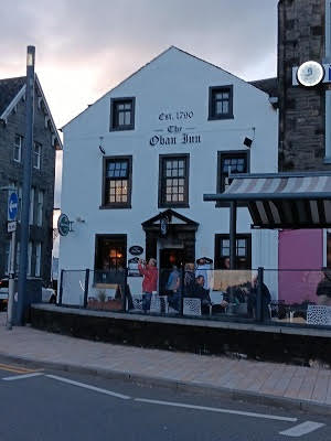 After several hours our group boarded the bus again, this time headed to Oban. We made a quick stop in the small town of Lochgilphead, by the Crinan Canal, that links Loch Fyne to the Clyde River. The tide was way out, making quite a picture of boats not sitting in water. We were about an hour away from Oban, heading north. Oban is famous for sea food, their harbor and the ferry terminals that take passengers to the Islands of Mull, Iona and Staffa. We would be staying in Oban for two nights. Our hotel was the Royal Hotel Oban, a Strathmore Hotel group. The original hotel was built in 1895 and has gone through some remodeling over the years. Our room looked out over the harbor area. It was listed as a 3-star hotel, which might have been a little generous. It was comfortable, but a bit creaky in the hallways and they tended to lean a little to one side. We had dinner at the hotel, which was good. After dinner we wandered to the Oban Inn. It was crowded in the downstairs bar, and the musician was mainly singing Rock and Roll songs. We wandered upstairs and found a great accordionist playing great Scottish songs. Finding seats, ordering some beers, we settled in for several hours of great music. When we left, the downstairs bar area was packed with lots of tourists and locals, also having a great time. Good start for our visit to Oban.