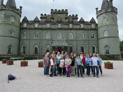 Loch Lomond is a freshwater Scottish Loch, a lake or sea inlet. It is 5 miles across at its widest point and 22.5 miles long. At 620 feet deep, it is one of the deepest lochs in Scotland. The loch is considered the boundary between the Highlands and the Lowlands. This loch forms part of the Trossachs National Park. There are many small islands in Loch Lomond, including Inch Murrin, the largest freshwater island in the British Isles. The Famous Scottish song, “The Bonnie Banks o’ Loch Lomond”, dates to 1745. Arriving in Luss, we parked and followed our tour leader Brian along narrow streets lined with stone homes and beautiful flower gardens in the yards. The homes are considered a historic landmark for the town. Many of the homes date to the 19th century. The small town only has 120 residents, but during tourist season, the town can swell to thousands, attracting 750,000 visitors a year. Luss is famous for kiltmakers and bagpipe makers. We walked down to a small dock where boats take tourists on a trip up and down Loch Lomond. Brian found an area to sit with his guitar and sang the famous “Bonnis Banks o’ Loch Lomond” song as well as a couple of other songs. After an hour or so, our group wandered back to the bus to continue on to an ABC (Another Bloody Castle).