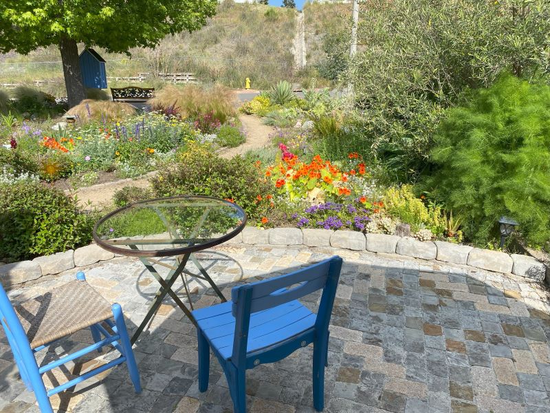 Ms. Chambers began by removing her turf and installing a decomposed granite path and a cobblestone sitting area; she then set out to create a drought tolerant garden with an emphasis on providing flowering plants for pollinators, such as butterflies, bees, and hummingbirds. Once the new garden was installed, the change in her front yard’s character was dramatic.