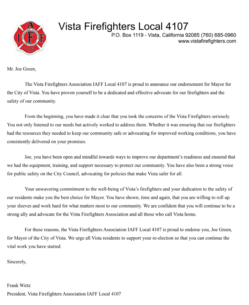 The VFFA 4107, has wholeheartedly endorsed Joe Green for his Mayoral run. Captain Wirtz said, “After careful consideration and deliberation, it is with great honor that we, the Vista Fire Fighters Association, stand united and proudly endorse Joe Green’s candidacy for Mayor of the City of Vista in 2026.”