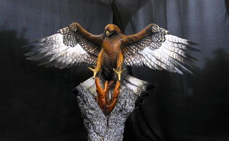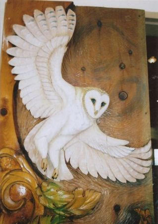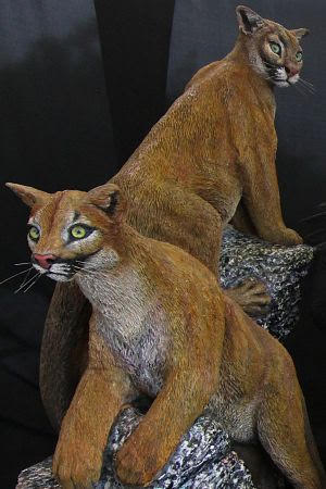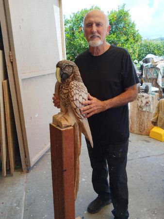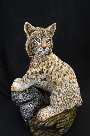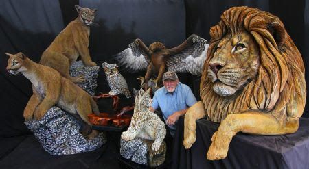 Vista woodcarver John Elsebusch has a philosophy of “If you can imagine it, I can create it” when carving his realistic, life-sized animal sculptures. Working with a variety of wood types, he said he has been carving since he was 9. He said he remembers carving small animal heads during a Cub Scout camp-out. His artistic ability led him not only to carve in wood but also to oil and acrylic painting, sketching, and even airbrushing designs for T-shirts. A 13-year employee of Lockheed, he was one of 27,000 people laid off in 1978, which led him to devote more time to a passion he had, carving in wood. John and his wife of 9 years have lived in Vista for 9 years. His house, garage, and workshop are a collection of beautiful life-sized animal carvings and furniture items he has made and is working on, as well as beautiful artistic wood burls and other wooden designs his wife, Mary Ann, makes and is working on.