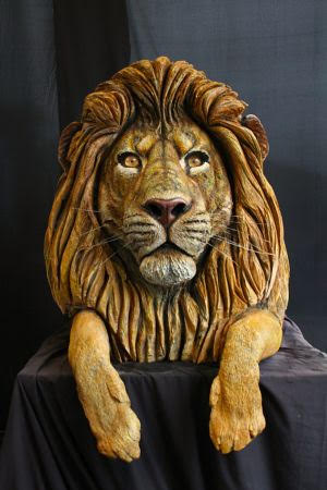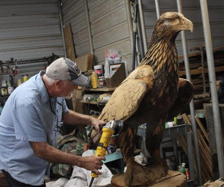 John and Mary Ann said they use a variety of wood types for their designs, including avocado, juniper, Redwood, Manzanita, torrey pine, Poplar, Oak, and more. He said Cedar is his favorite to work with. John’s carvings appear in individual homes, private collections, art galleries, wineries, hotels, lobbies, just about anywhere. He said they are perfect for lodges, cabins, museums, zoos, anywhere animals can be found. John said he designed and carved a beautiful Christmas door and arch for a local Vista resident and an even more impressive large Christmas bench that is now in a church. A massive full-scale buffalo was carved for the San Jacinto Buffalo Ranch, and a large door entry way and arch can be found at the South Coast Winery and Resort in Temecula, and a full-sized mountain lion is in the bar at the Resort. He has entered the wood working display area at the San Diego County Fair and won “People’s Choice” several years ago with his massive eagle with spread wings. John said he will be entering three woodworking carvings this year, including the huge lion carving.