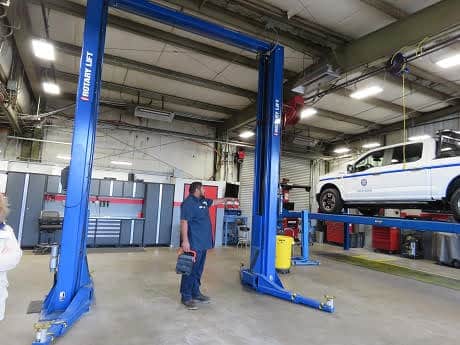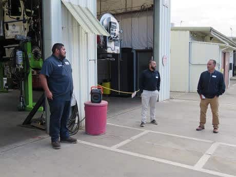 The fifth meeting for the current Leadership Academy attendees included a tour of the City of Vista Public Works facility and presentations from Chris Arce, Public Works Director and Sewer Engineering Manager Ken Knatz. Meeting at the Public Works facility at 1165 E. Taylor Street, Chris Arce welcomed the group and spoke about what the tour would consist of as well as what exactly Public Works represents and entails in the City of Vista. Chris has been with the City of Vista for 12 years, appointed as the Director of Public Works in August of 2024. Entering the gates into the Public Works storage yard and work area, our first stop was at the Fleet Maintenance Garage where the group heard from Operations Manager Cirilo Mariscal, Operations Supervisor Aldo Hernandez and Fleet Maintenance Worker II Albes Pineda. Albes described the maintenance the 5 technicians do on the 280 Public works vehicles in the city. This service includes all aspects of maintenance from the yearly inspections, engine repairs, tires, and all aspects of the small and large vehicles that are part of the white and red (fire) fleets. Several vehicles, a large truck and a fire vehicle were on the Ari-hetra lifts, capable of lifting 16,000 lbs. each. He also showed the massive Rotary Lifts in another garage area capable of lifting the largest of the vehicles that need work. Chris Arce pointed out the gas pumps they use to refill all of the vehicles and pointed out they have a joint use agreement with the Vista Unified School District who also refill their school buses at the pumps. Chris said they also have electric charging stations as some of the newer vehicles are now electric. He said they will be adding more charging stations as they begin to add more electric vehicles to their fleet. Cirilo and Aldo also spoke about the variety of vehicles they maintain and the training all of their technicians go through to be able to repair the tremendous variety of vehicles in their fleet. The technicians all have special training for maintaining the various fire engines they service.