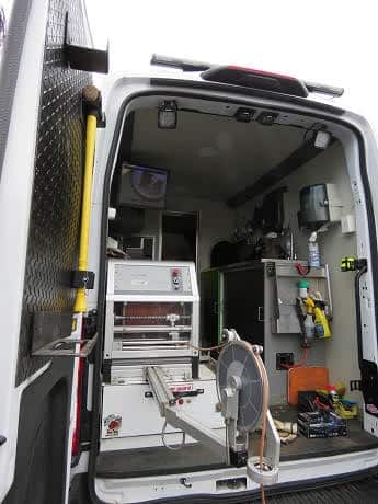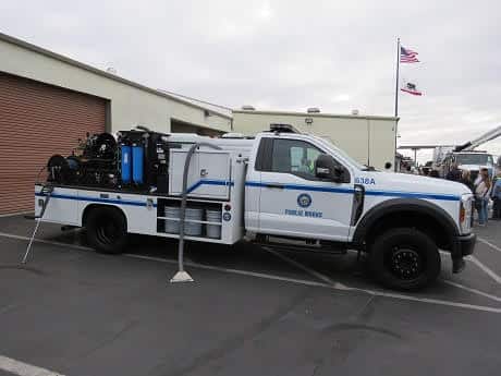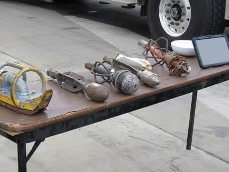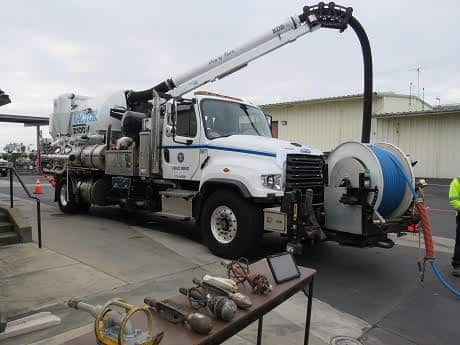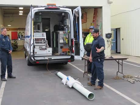 Next up for the Public Works tour was the Wastewater Department. This department is responsible for the over 326 miles of sewer pipes and wastewater drainage areas throughout Vista. Our first presenter from this division was Gerardo Oliveras who demonstrated the intricate CCTV mobile unit that can send a variety of robots through the sewer lines to inspect them and determine what any issues may be. Gerardo has been the recipient of Wastewater awards for his knowledge and service to the City of Vista. He showed how these robots worked and the elaborate controls inside the van where all of the controls and TV screens are located for them to review. Gerardo said along with the miles of sewer lines there are 5,500 manholes that allow access to the sewer lines in Vista. He said all of the sewer pipes in Vista are on a 5–15-year inspection schedule. After his presentation we turned to the next Wastewater presentation, which was delivered by 13-year Public Works employee Joe Orozco. Joe is a member of one of the several crews for the Wastewater Division that repair any problems sewer or wastewater lines have. They do this through the use of a very large vehicle that holds water and hoses that are inserted into the sewer lines along with a variety of bits to clean out any blockage. Joe showed our group a table with numerous large bits that can cut through tree roots, grease and any other blockage in the pipes as well as the different sized wheels that can be attached to the lines. He demonstrated the cleanout process that can generate 1,800-2,500 psi of water when turned on. Three of these trucks and their teams are out each day taking care of problems or cleaning the lines on the established maintenance schedule.