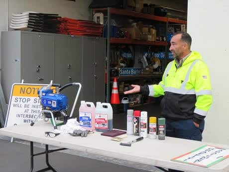 The Leadership Academy group next stopped by the Graffiti/Signs Division of the Public Work Department. Joe Lopez, who has been with the Public Works Department for 28 years, said they have a number of workers who are lifelong Vista residents and are very proud of the work they do for Public Works. Not only are they responsible for the wide variety of signs found throughout the city, but they are also responsible for cleaning and removal of any graffiti reported to the department. Arce said Joe and their crews try to get any graffiti reported completely removed or covered within 24 hours after they receive notice of the incidents. Joe showed all of the various products they use for graffiti removal or covering the graffiti as well as one of the large Public Works vehicles used specifically for graffiti removal. When asked about the problem areas for graffiti, it was pointed out the Skate Park does have some issues around the restroom. Chris and Joe both went over the fines and penalties individuals caught graffiting would go through and be charged with if caught. They pointed out that not all graffiti is gang related as there a several “crews” that graffiti areas, almost as a contest. Chris said the Sheriff’s Department will photograph all of the graffiti and have created files with similar graffiti to try and establish who is responsible.